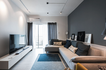 "The backdrop of the home features a clean and plain aesthetic, with desaturated off-white tones on ceilings and walls, complemented by shades of grey and beige in the fixtures and furniture. "