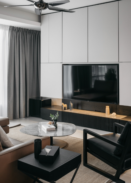"Nestled near the city’s bukit timah reserve, this urban modern home was designed as a tranquil retreat from hectic city life. Embracing a dual-key concept, the layout was merged into one cohesive setting for enhanced personal space. The design emphasizes a calming atmosphere with earthy tones, natural materials like wood, stone, and cement, and sleek built-in forms for a clean aesthetic. A custom timber feature wall, serving both as storage and display, creates a seamless visual journey from entrance to corridor’s end."